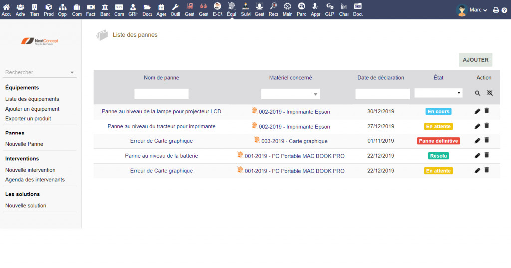 De Fleet Equipment Management-module, evenals storingen en interventies, biedt u de volgende functionaliteiten: - Introduceer de lijst met apparatuur en producten van uw bedrijf om ze te beheren - Introduceer de interventies, storingen en oplossingen die op elk apparaat worden uitgevoerd.
