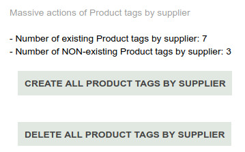 With this module you can create product tags by supplier for your buyed products. You can use this tags as a filter in lists and statistics. The process can be automatic, or manual. By default, theses tags can have a specific color, a specific prefix, or/and a specific parent tag. You can filter to only create these product tags for products buyed and also for sale.