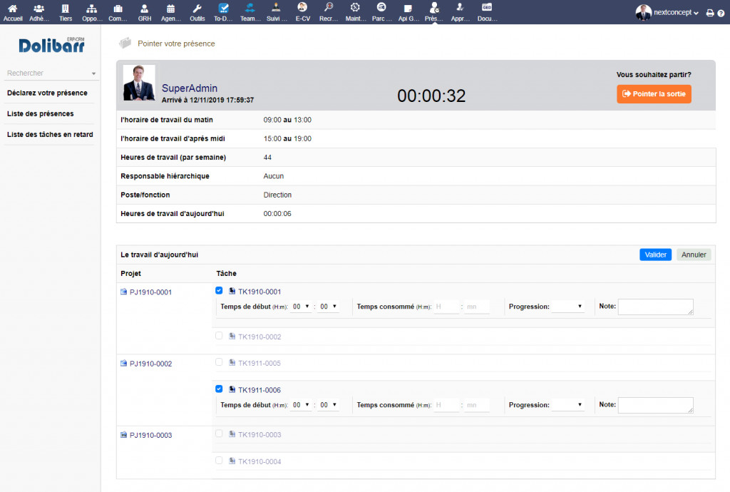 - Fortschritte und Verzögerungen bei einigen Aufgaben sind gerechtfertigt oder nicht gerechtfertigt. - Jeder Mitarbeiter verwendet die digitale Zeituhr, um die für eine Aufgabe oder ein Projekt aufgewendete Zeit zu messen. - Es wird eine direkte Verbindung zwischen dem Modul "Mitarbeiteranwesenheit" und dem Modul "Projektmanagement" hergestellt. - Wiederherstellen der verbrauchten Zeit, damit der Fortschritt für eine Aufgabe automatisch in der Verbrauchsverwaltung für die Projekte deklariert wird. - Bitte gehen Sie späten Aufgaben nach und kennen Sie die berechtigten und ungerechtfertigten Verzögerungen jedes Mitarbeiters. - Behalten Sie die Rückverfolgbarkeit und den digitalen Bewertungsverlauf Ihrer Mitarbeiter auf einer einzigen Oberfläche. Als u onze module bestelt, profiteert u van: