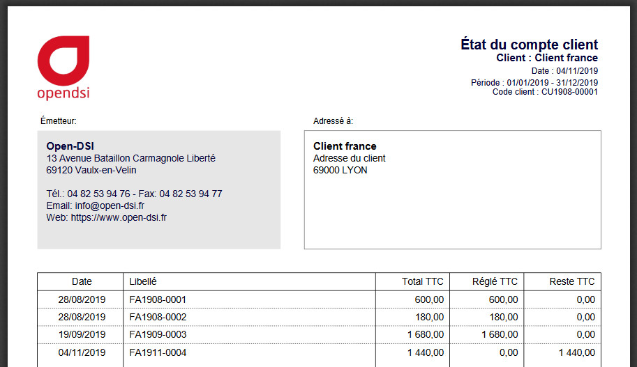 Customer account statement allows the creation of a report of a customer / supplier statement in PDF/CSV format on defined dates.