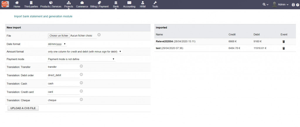 This module allows to generate your vendor invoices, taxes, VAT, social charges, payment of loan and payment of invoice bill from a csv bank statement file. It also mades automatic payment and conciliation of the bank statement.