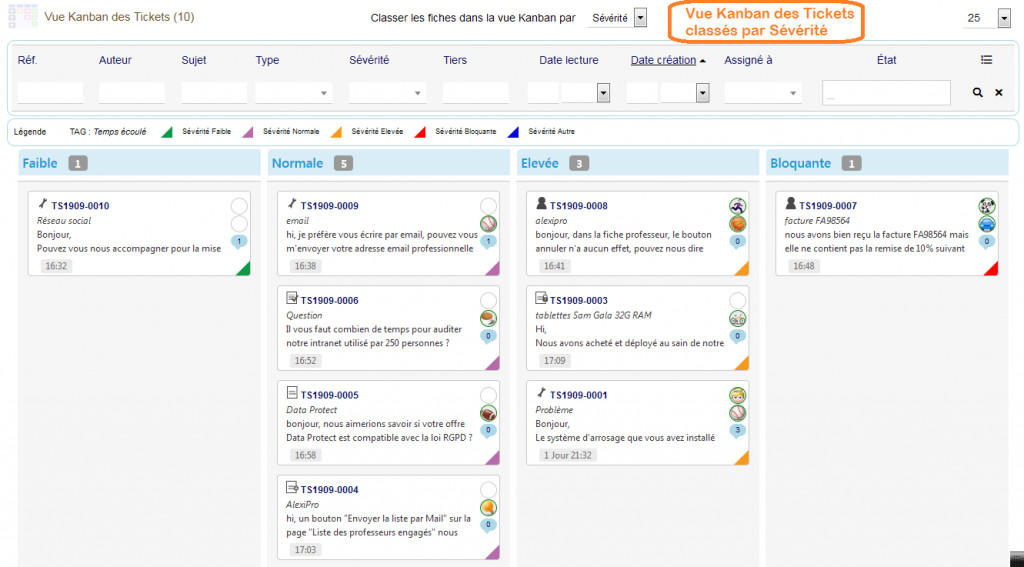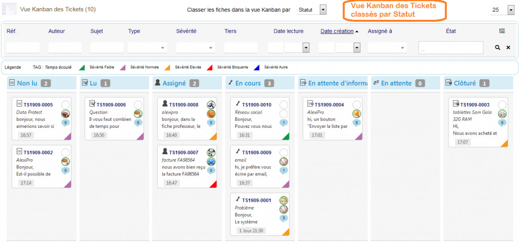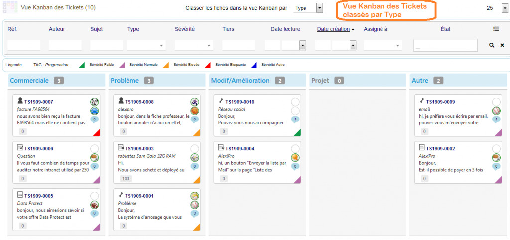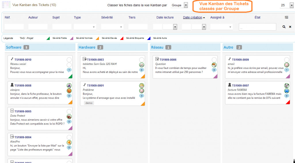 KanTickets pour Dolibarr gère un ensemble de vues Kanban pour le module Ticket. Il est possible de classer les Tickets de différentes manières dans des vues Kanban user friendly. Les vues Kanban disponibles sont : Statut, Sévérité, Type et Groupe. Les fiches Kanban sont affichées dans des colonnes, il est possible de faire passer une fiche d'une colonne à l'autre par Drag&Drop.