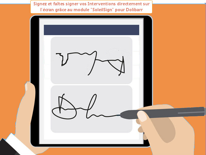 The SoleilSign module for Dolibarr adds a pdf printing template to Interventions module for electronically signing the generated pdf, thereby shortening the print/sign/scan cycle. Usage example: - Your Intervening comes to your customer for an intervention. - When the work is finished, the Intervening and the Customer can sign the Intervention card directly on the screen, thanks to SoleilSign.
