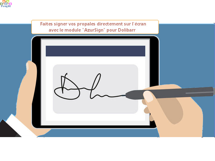 The AzurSign module for Dolibarr adds a pdf printing template to propals for electronically signing the generated pdf, thereby shortening the print / sign / scan cycle. One of the possible usage scenarios: - Your representative comes to your customer with a quote/propal. - If your customer agrees, he can sign directly on the screen, thanks to AzurSign.