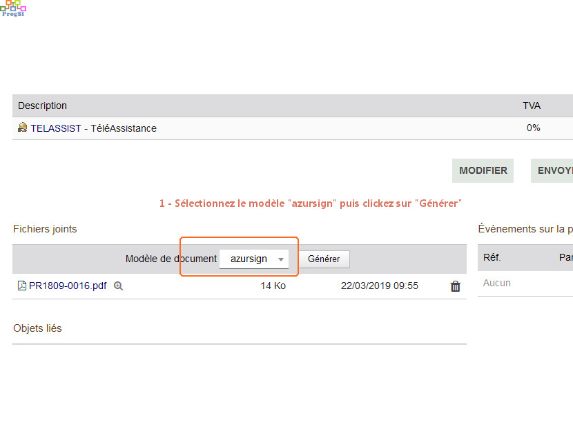 The AzurSign module for Dolibarr adds a pdf printing template to propals for electronically signing the generated pdf, thereby shortening the print / sign / scan cycle. One of the possible usage scenarios: - Your representative comes to your customer with a quote/propal. - If your customer agrees, he can sign directly on the screen, thanks to AzurSign.