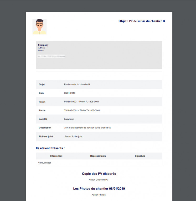 1- Saisir les états d'avancements de votre chantier; 2- Attacher les documents (doc, pdf, xls, ppt) et les photos réelles (png, jpg...) de vos chantiers dans les états d'avancements; 3- Elaborer les PV des chantiers; 4- Saisir les différents intervenants sur le chantier de construction; 5- Editer les états d'avancements et les PV sous forme de fichier PDF; 6- L'envoie par mail des états d'avancements et les PV aux différents intervenants sur le chantier de construction. If you order our module you benefit from: