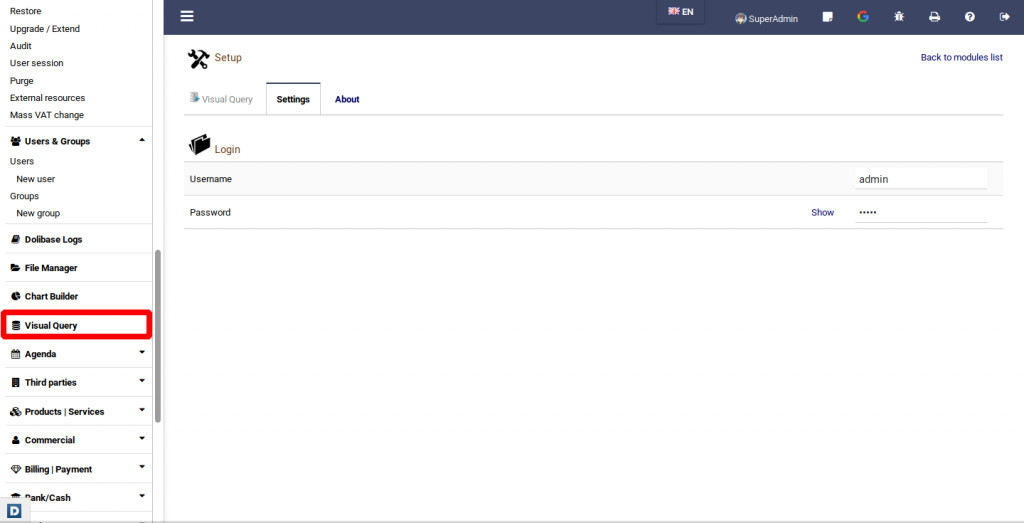 Integrates VisualQuery into dolibarr. For people facing page not found issue, ensure that rewrite engine is enabled on your web server.
