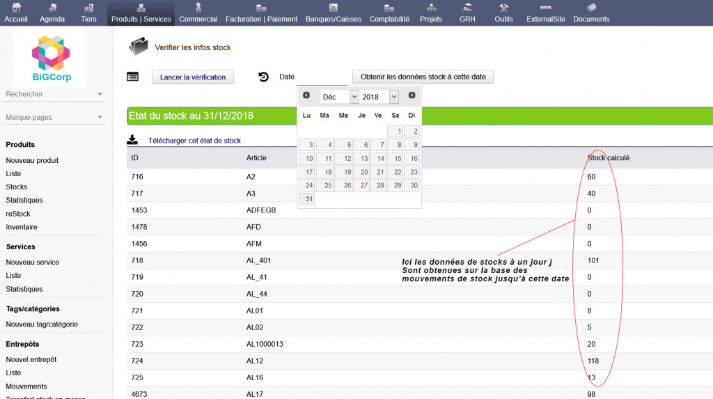 Il comprend un outil vous permettant d'obtenir l'état du stock pour une date antérieure.