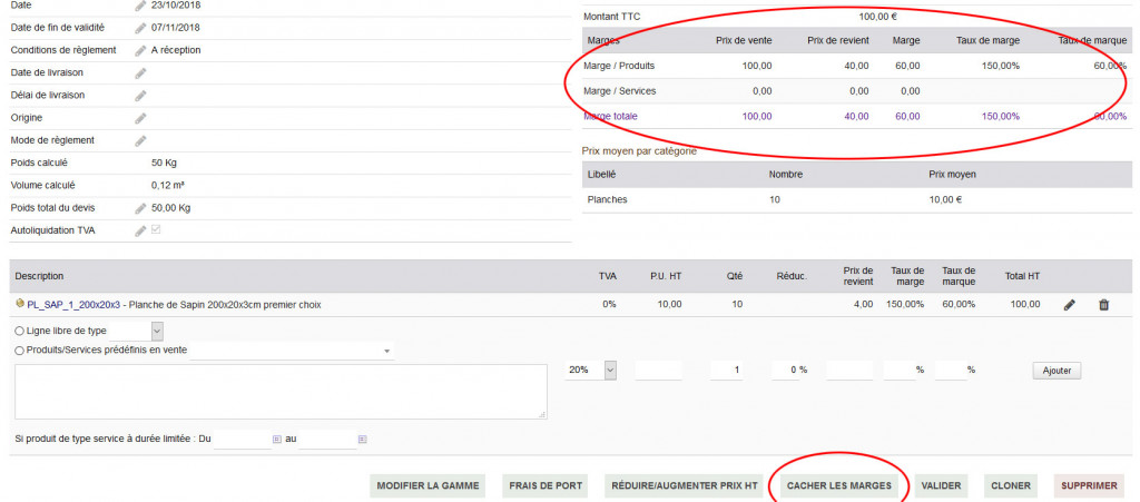 The dolibarr margin display module allows you to show/hide margins on quotes with a button.