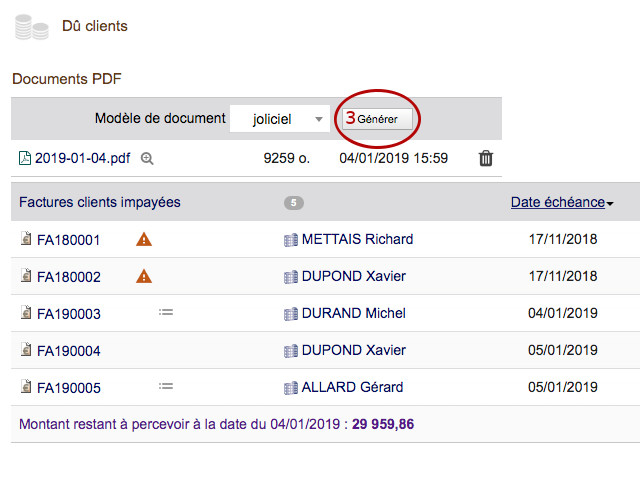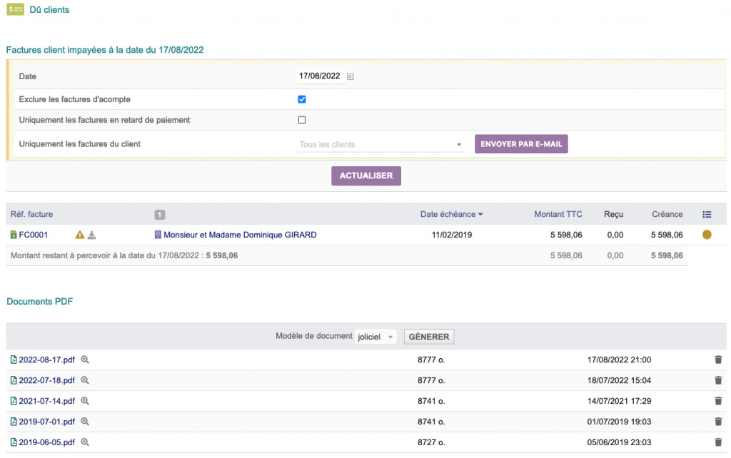 Suivre les détails de paiement des clients Permet de générer un tableau PDF, des factures restant dues par les clients (ou un client précis), à une date donnée. Permet d’afficher le montant restant dû par les clients sur l’écran d’accueil de Dolibarr Démo : https://www.youtube.com/watch?v=5aOJIox8OlI Support technique : dolibarr@joliciel.fr