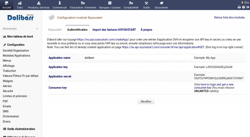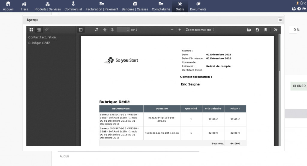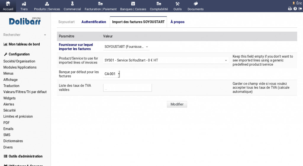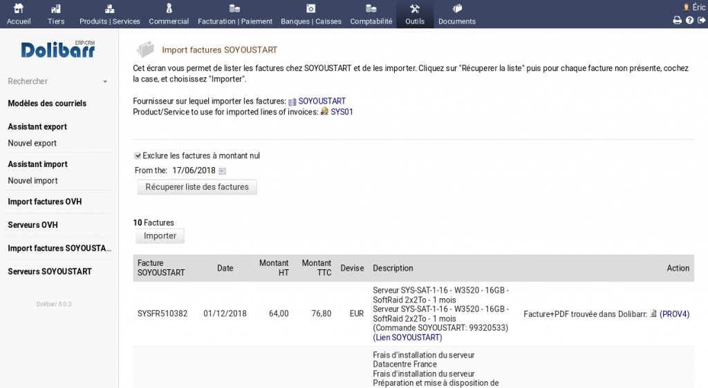 SoYouStart (Invoice Import) 3.8 - 14.0.* Add interfaces to SOYOUSTART services: * Provide a page to import SOYOUSTART invoices into Dolibarr (creation into Dolibarr + download of SOYOUSTART PDF) Maybe more SOYOUSTART services are coming (dedicated servers access ...).