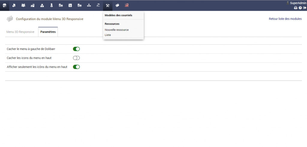 El módulo "Menú 3D responsivo" le permite ampliar la interfaz de trabajo de su plataforma Dolibarr, para que pueda ocultar el menú a la izquierda o usar el nuevo Menú Vertical en la parte superior con el submenú como si estuviera navegando por un sitio web dinámica.