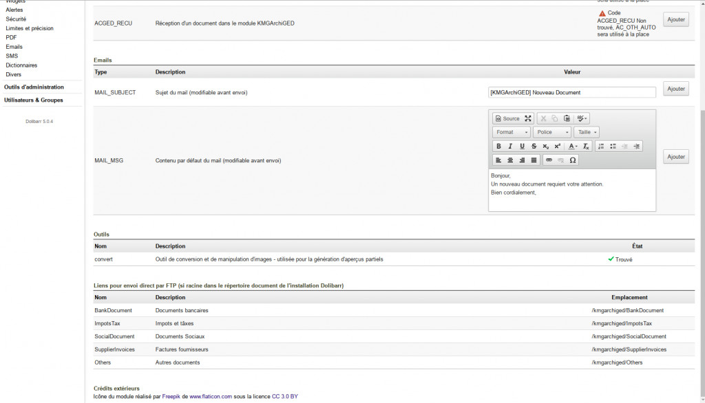 The KMGArchiGED module has been developed to allow the management of incoming documents within a structure, their reception from a scanning device managing the sending via FTP, their transmission by email, their link with native elements of Dolibarr, as well as than their archiving.