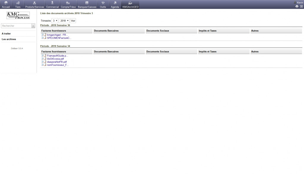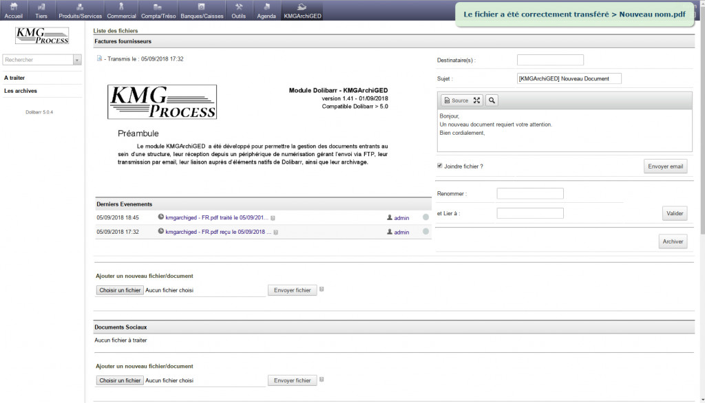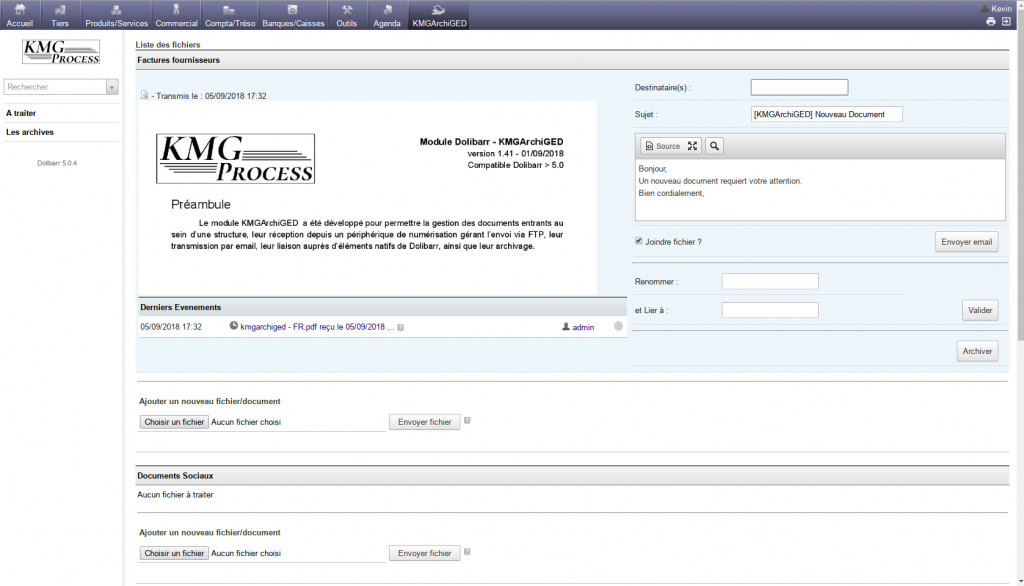 The KMGArchiGED module has been developed to allow the management of incoming documents within a structure, their reception from a scanning device managing the sending by FTP, their transmission by email, their link with native elements of Dolibarr, as well as than their archiving.