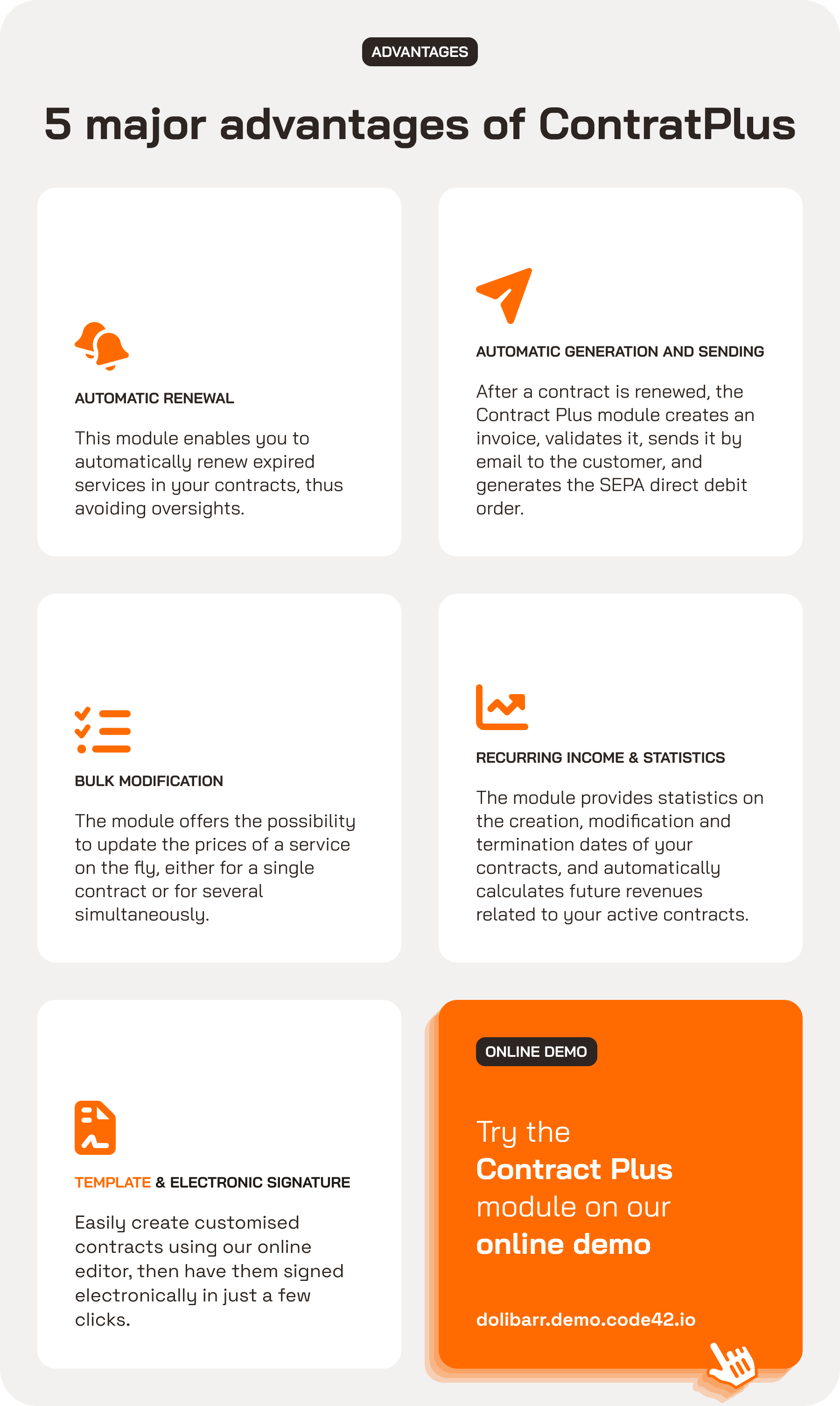 The uses related to the contracts and associated services take place in 7 manual steps, Contract Plus v2 - takes the features of Contract Plus v1 : While adding: Compatibility with v15 and above The possibility to send the invoice by email to the billing contact Mass modification of the price of a service for a part OR for all the contracts History of contract modifications.