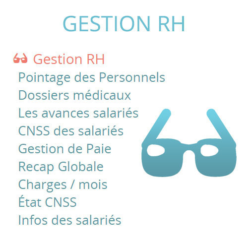 1- Punteggio personale 2- Cartella clinica 3- Avanzamenti dei dipendenti 4- dipendenti CNSS 5- Gestione delle buste paga 6- Riepilogo globale 7- Addebiti / mese 8- Stato CNSS Se ordini il nostro modulo beneficerai di: