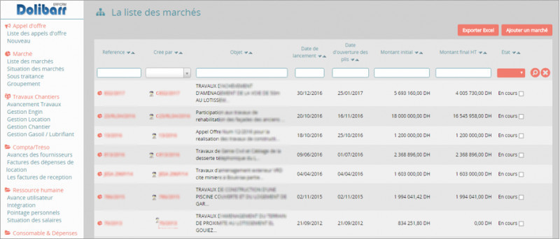 This module allows the management of tenders, contracts, site works, staffing, site equipment consumption, building materials management and workstations on each site. - Tenders Management - Market Management - Building Works - Buy Sell - Compta / Tréso Chantiers - Human ressources - Consumables & Expenses
