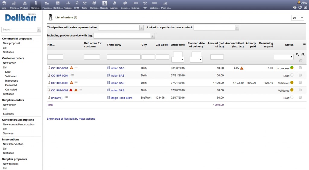 The module add columns into the list of orders to show the amount billed for each order and the remain to bill. The amount visible is total of all invoices linked to the order. Note: Values added by this module will be useless if you make one invoice for several orders. But if you make one invoice for each order, it will save you time to see, in one page, list of orders and remain to bill.