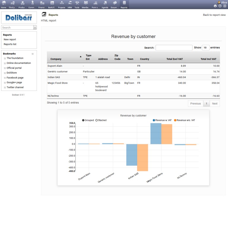 Dolireport is a Dolibarr module created to publish reports from data extracted directly from database tables. It is made on Reportico's engine and is natively integrated in Dolibarr, so it benefits of the ERP's advanced functionnalities.