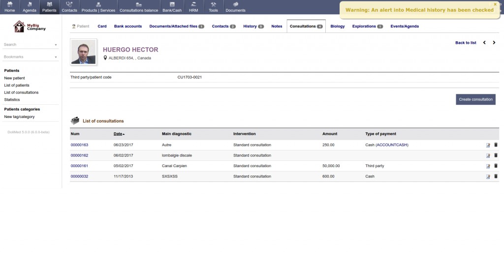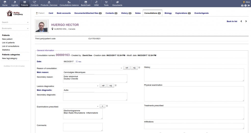 DoliMed est un module de gestion d'un cabinet médical ou de l'activité de médecins libéraux. Permet le suivi des patients, consultations, prescriptions, comptes rendus de consultation, alertes patients, etc...