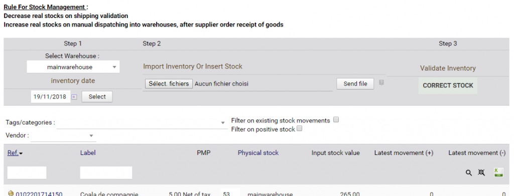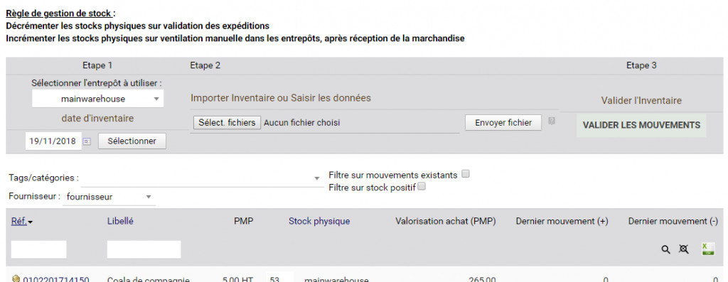 Module allowing to make an inventory in a given date, and to update the stock by that time, while taking into account made entrances / exits (customer order, supplier order)