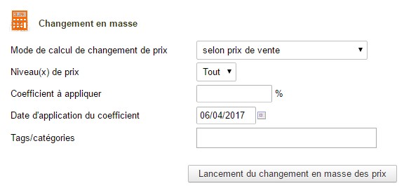 Selling prices mass updating by category and price level according to the purchase price (less or better supplier), sale price or cost price. Creation of a sales price history and deletion of old data by date.