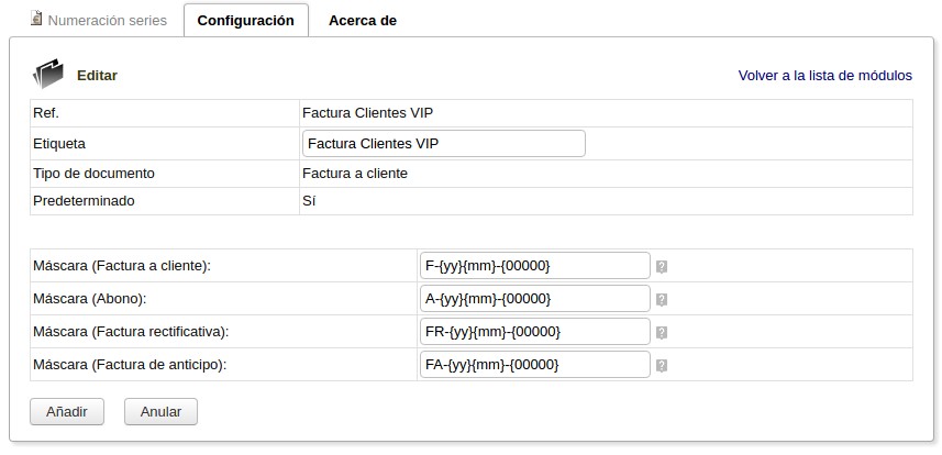 Management serial numbers module for Dolibarr ERP & CRM. In this module you can manage the masks of invoices, orders and proposals, both suppliers and customers. It can choose at any time what numbering series to be used in each document via a dropdown.