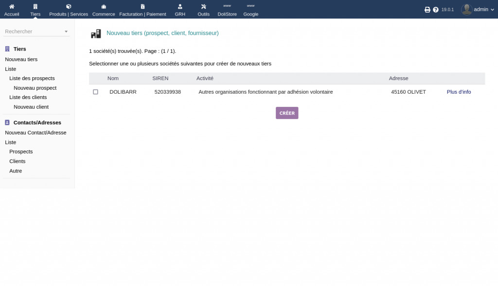 Create a third recovering all of the third party information via API societeinfo.com It is necessary to create an account on societeinfo.com. Copy the key in the module configuration.