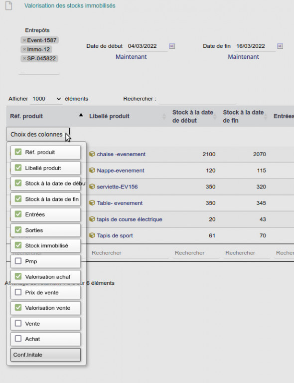 It will show you buying and sell prices of you stock. You also have an option to show the stock of a product and/or its valuation per warehouse.