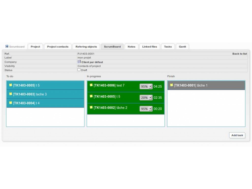Module adding a tab to a project card for managing tasks via a scrum board. Included features to update task percentage and record times, progression bar and possible date of delivery, date task auto-reset (on 3.5)