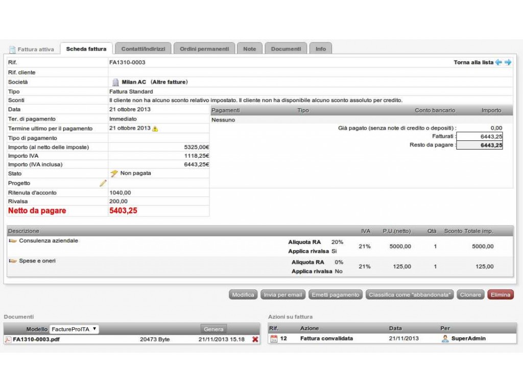 Module for the italian market. Italian description: Versione FREE del modulo. Permette la gestione della ritenuta d'acconto e dell'esenzione IVA all'interno delle fatture fornitori secondo la normativa italiana. Aggiunge alle singole righe delle fatture fornitori 2 campi: - Aliquota Ritenuta d'acconto - Esenzione IVA Troverete anche "ritenuta d'acconto" tra i tipi di pagamento disponibili.