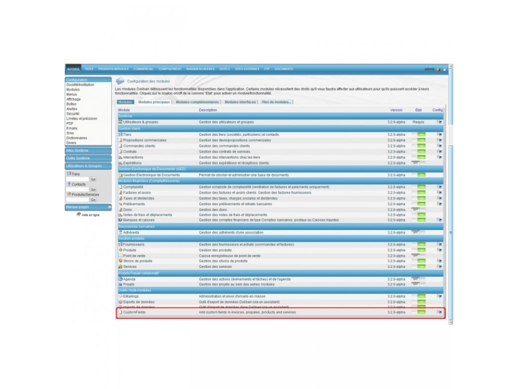 Ajoutez facilement des champs personnalisables dans les factures, propositions commerciales, produits, services et commandes. Ce module est adaptable à d'autres modules et d'autres versions de Dolibarr (instructions dans Readme-CF.txt).