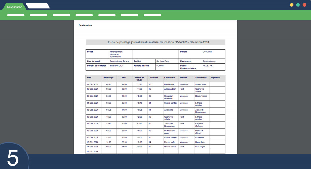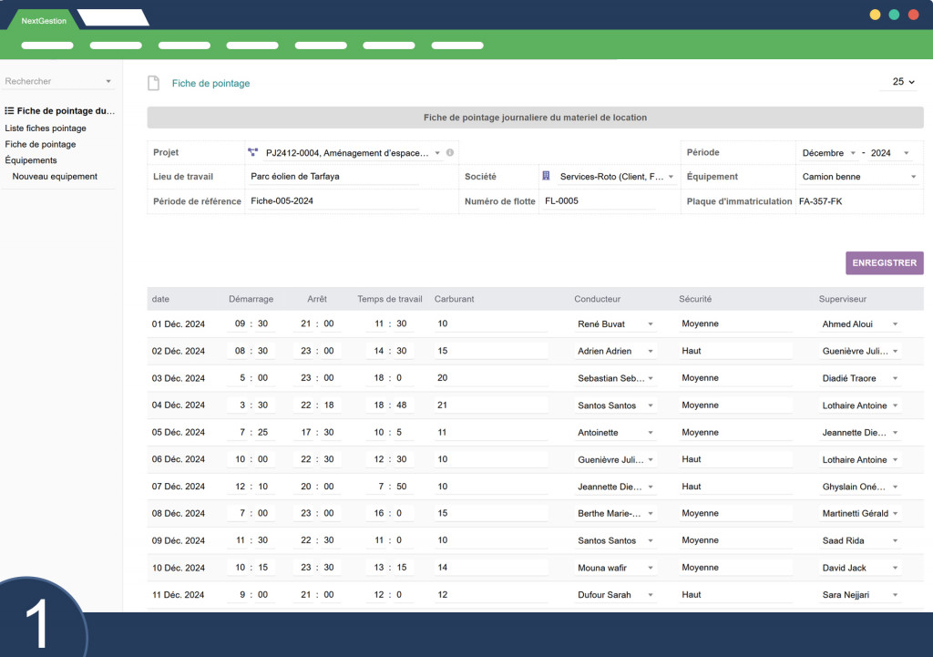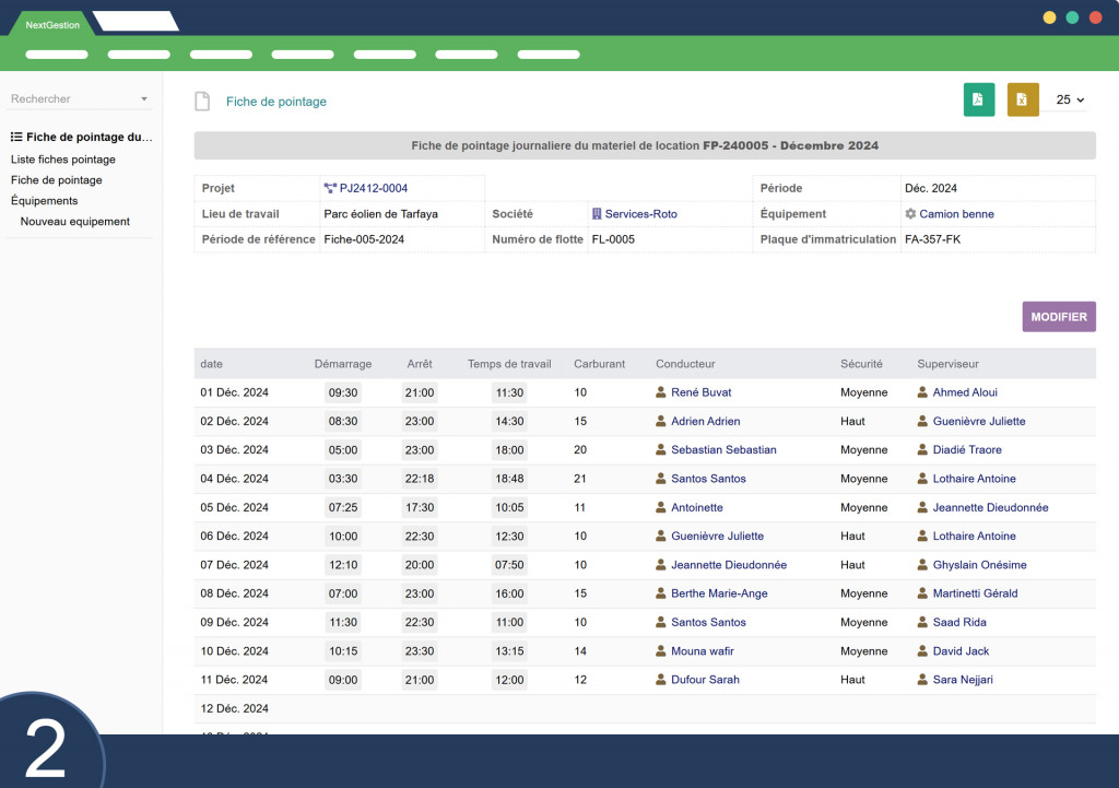 Equipment Time Tracking The “Equipment Time Tracking” module in Dolibarr enables daily tracking of rental equipment usage, particularly in industrial or construction project contexts. This module facilitates the entry, monitoring, and management of equipment work hours and drivers while allowing detailed analysis of equipment performance and fuel consumption. Below are the main features and characteristics of this module: 1. Time Tracking Data EntryThe module allows recording of essential data related to equipment usage. Each time tracking sheet includes fields for: