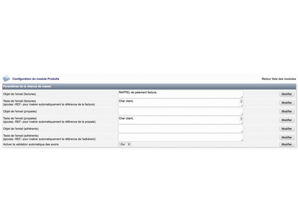 Module permettant d'automatiser les relances ou rappel par mail pour les factures impayées et propositions commerciales ouvertes 'en un clic) . Dans les listes de retard on trouve une coche à chaque ligne pour relancer les clients par mail (mail du tier). L'avantage est de pouvoir cocher tous les retards et ou impayés, et de les renvoyer par mail en une seule manipulation (l'E-mail du tier). configuration des message de rappel possible pour l'objet et contenu de l'émail de relance (titre et le corps de texte).