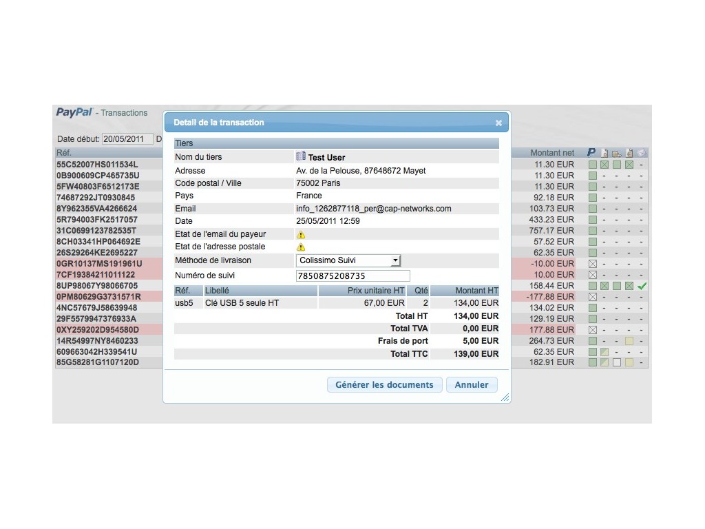 This module is an extension of the basic module Paypal contained in Dolibarr. It allows you to list and see the details of your Paypal transactions. - Automatic creation of customer records - Automatic creation of purchase orders, delivery notes and invoices + payment on bank account.