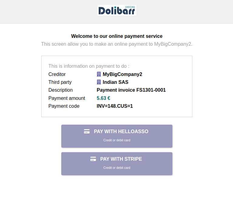 Offer customers a HelloAsso online payment page (credit/debit cards). This can be used to allow your customers to make ad-hoc payments or payments related to a specific Dolibarr object (invoice, order etc...)