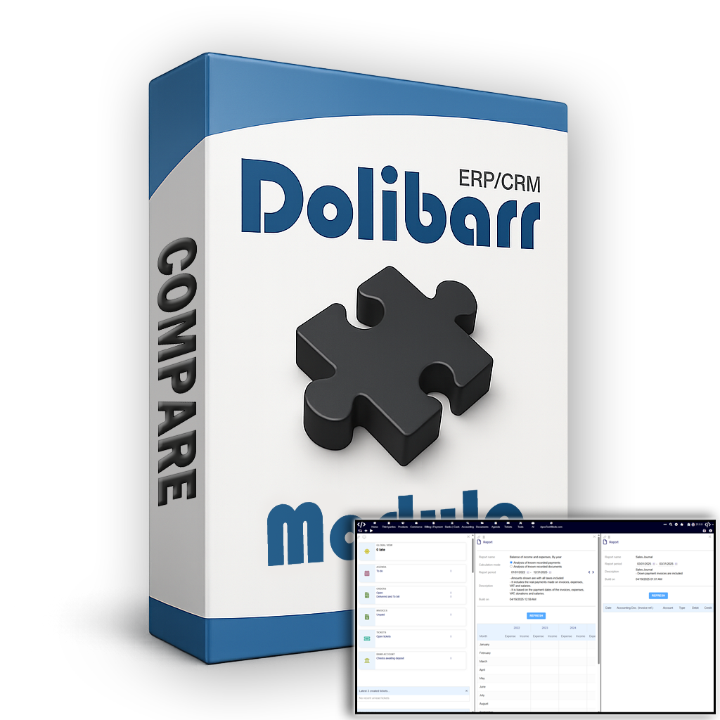The Compare module is a powerful productivity tool for Dolibarr users who need to analyze, cross-reference, or verify data across multiple pages at once. With support for up to five resizable iframe columns, the module provides a fully interactive, side-by-side layout where each page can be independently loaded and toggled between desktop or mobile view. Toolbars provide quick access to swap views, add new columns, reload content, or generate a clean, print-optimized report with automatic page numbering. Data persists via local storage, ensuring your work continues uninterrupted between sessions. Because the Compare module is built to integrate without altering Dolibarr's core code, it remains fully compatible with version updates, making it an ideal tool for workflows, product auditing, and administrative reviews.