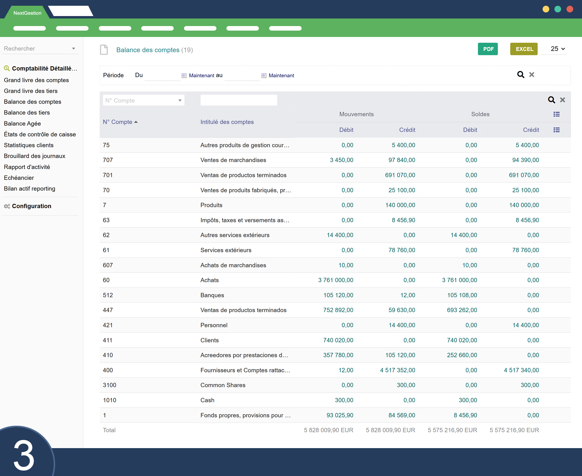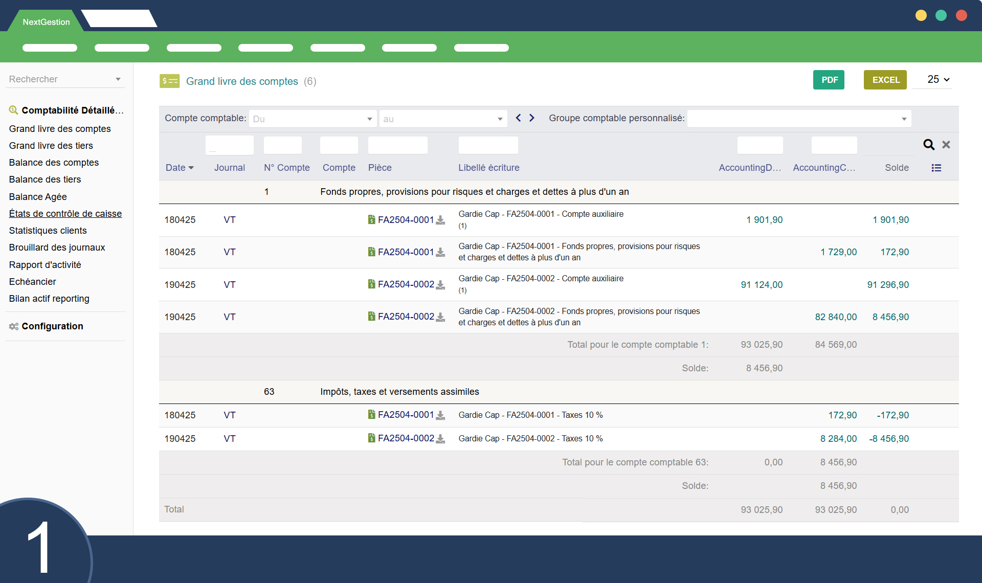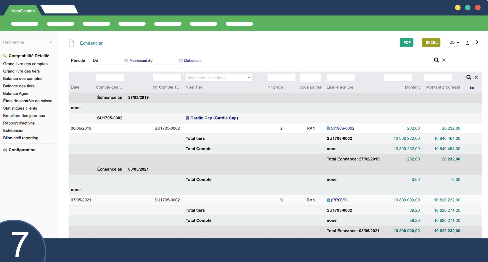 Présentation Fonctionnelle ComplèteLe module Comptabilité Détaillée Sage de NextGestion est une solution comptable complète, conçue pour répondre aux standards professionnels les plus rigoureux. Inspiré de la logique Sage, il permet une gestion fine et centralisée des opérations comptables, garantissant traçabilité, transparence et efficacité décisionnelle. Grâce à une interface claire, des rapports dynamiques et des fonctions d’analyse avancées, ce module permet aux entreprises de suivre leur santé financière en temps réel, tout en produisant des états compatibles avec les obligations comptables et fiscales. Menu Fonctionnel et Description Détaillée✅ 1. Grand livre des comptesAffiche toutes les écritures comptables classées par comptes généraux, avec détails par date, journal, numéro de pièce, libellé, et solde. Il offre la possibilité de filtrer les données par période, compte ou libellé, et d'exporter les résultats en PDF ou Excel. ✅ 2. Grand livre des tiersPermet de consulter toutes les écritures liées aux tiers (clients et fournisseurs) avec un suivi détaillé des débits, crédits et soldes, regroupés par partenaire. Idéal pour suivre les engagements contractuels ou commerciaux. ✅ 3. Balance des comptesPrésente les soldes débiteurs et créditeurs de chaque compte, ainsi que les mouvements enregistrés sur une période donnée. Ce tableau de synthèse permet de vérifier l’équilibre comptable de l’ensemble des opérations. ✅ 4. Balance des tiersOffre une vue consolidée des soldes clients et fournisseurs à travers les comptes de tiers. C’est un outil essentiel pour mesurer les créances à recouvrer ou les dettes à payer. ✅ 5. Balance âgéeAffiche la répartition des créances et dettes selon leur ancienneté (échéance non échue, 30 jours, 60 jours, 90 jours...). Ce rapport est crucial pour évaluer le risque d’impayés et la performance de la gestion client. ✅ 6. États de contrôle de caisseSuivi précis des mouvements de trésorerie : encaissements, décaissements, soldes initiaux et finaux. Outil clé pour assurer le rapprochement bancaire et la gestion du cash quotidien. ✅ 7. Statistiques clientsGénère des indicateurs détaillés sur le chiffre d’affaires client, les soldes ouverts, les tendances d’achat et la croissance client. Permet d’identifier les meilleurs clients et d’orienter la stratégie commerciale. ✅ 8. Brouillard des journauxAffiche les écritures comptables en cours de validation avant leur intégration définitive dans la comptabilité. C’est un espace de prévisualisation et de contrôle qui renforce la sécurité des saisies. ✅ 9. Rapport d'activitéPermet d’éditer des rapports synthétiques sur les flux comptables globaux : montants totaux, fréquences des opérations, nature des écritures. Ce module fournit une vue macro sur l’activité économique de l’entreprise. ✅ 10. ÉchéancierListe des échéances de paiement futures ou passées, regroupées par tiers ou par pièce comptable. Outil essentiel pour le suivi des règlements à venir, des délais et des relances. ✅ 11. Bilan actif reporting