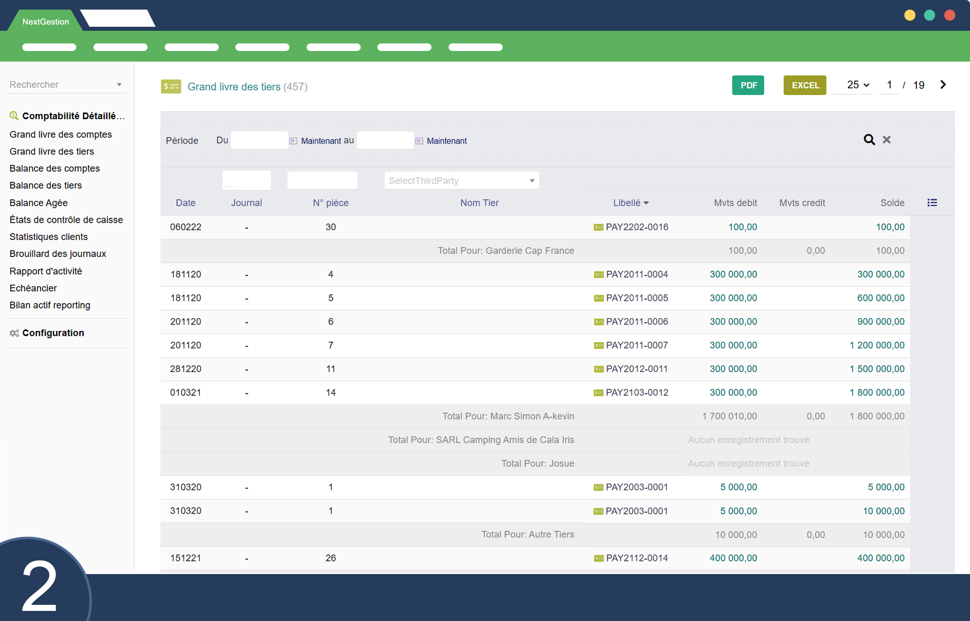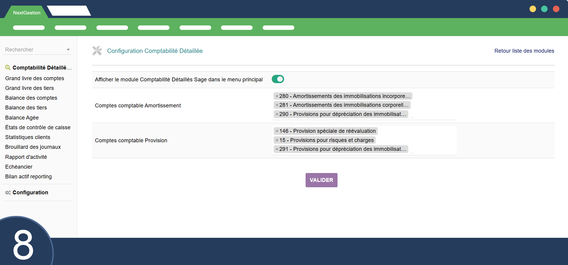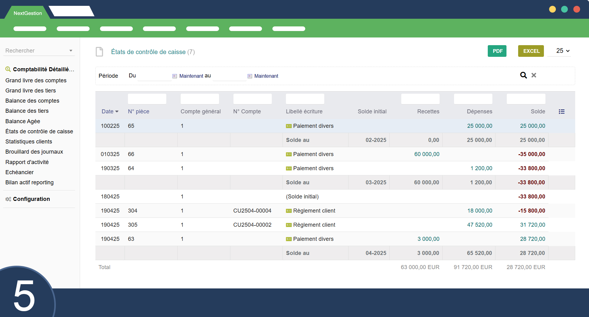 Présentation Fonctionnelle ComplèteLe module Comptabilité Détaillée Sage de NextGestion est une solution comptable complète, conçue pour répondre aux standards professionnels les plus rigoureux. Inspiré de la logique Sage, il permet une gestion fine et centralisée des opérations comptables, garantissant traçabilité, transparence et efficacité décisionnelle. Grâce à une interface claire, des rapports dynamiques et des fonctions d’analyse avancées, ce module permet aux entreprises de suivre leur santé financière en temps réel, tout en produisant des états compatibles avec les obligations comptables et fiscales. Menu Fonctionnel et Description Détaillée✅ 1. Grand livre des comptesAffiche toutes les écritures comptables classées par comptes généraux, avec détails par date, journal, numéro de pièce, libellé, et solde. Il offre la possibilité de filtrer les données par période, compte ou libellé, et d'exporter les résultats en PDF ou Excel. ✅ 2. Grand livre des tiersPermet de consulter toutes les écritures liées aux tiers (clients et fournisseurs) avec un suivi détaillé des débits, crédits et soldes, regroupés par partenaire. Idéal pour suivre les engagements contractuels ou commerciaux. ✅ 3. Balance des comptesPrésente les soldes débiteurs et créditeurs de chaque compte, ainsi que les mouvements enregistrés sur une période donnée. Ce tableau de synthèse permet de vérifier l’équilibre comptable de l’ensemble des opérations. ✅ 4. Balance des tiersOffre une vue consolidée des soldes clients et fournisseurs à travers les comptes de tiers. C’est un outil essentiel pour mesurer les créances à recouvrer ou les dettes à payer. ✅ 5. Balance âgéeAffiche la répartition des créances et dettes selon leur ancienneté (échéance non échue, 30 jours, 60 jours, 90 jours...). Ce rapport est crucial pour évaluer le risque d’impayés et la performance de la gestion client. ✅ 6. États de contrôle de caisseSuivi précis des mouvements de trésorerie : encaissements, décaissements, soldes initiaux et finaux. Outil clé pour assurer le rapprochement bancaire et la gestion du cash quotidien. ✅ 7. Statistiques clientsGénère des indicateurs détaillés sur le chiffre d’affaires client, les soldes ouverts, les tendances d’achat et la croissance client. Permet d’identifier les meilleurs clients et d’orienter la stratégie commerciale. ✅ 8. Brouillard des journauxAffiche les écritures comptables en cours de validation avant leur intégration définitive dans la comptabilité. C’est un espace de prévisualisation et de contrôle qui renforce la sécurité des saisies. ✅ 9. Rapport d'activitéPermet d’éditer des rapports synthétiques sur les flux comptables globaux : montants totaux, fréquences des opérations, nature des écritures. Ce module fournit une vue macro sur l’activité économique de l’entreprise. ✅ 10. ÉchéancierListe des échéances de paiement futures ou passées, regroupées par tiers ou par pièce comptable. Outil essentiel pour le suivi des règlements à venir, des délais et des relances. ✅ 11. Bilan actif reporting