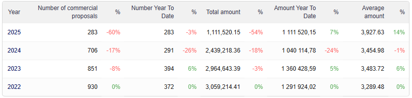 If statistics to date are enabled in the module configuration and the user has the right to view them, then he will see four additional columns: number to date, amount to date and the rate of change from year to year of the previous two columns.