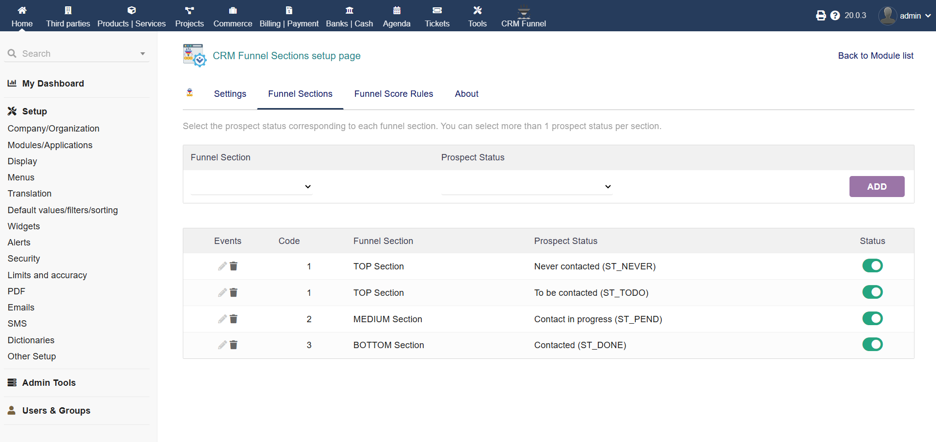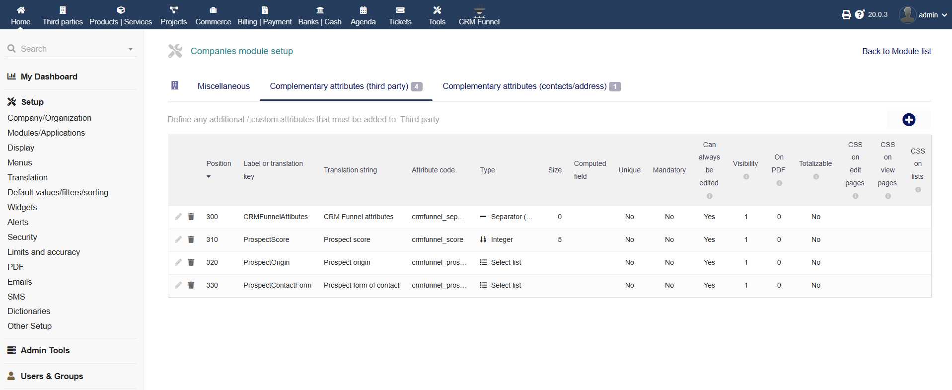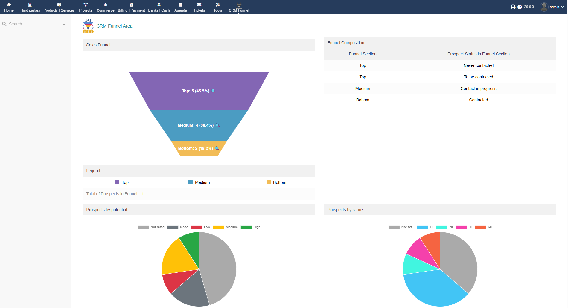 This module adds a sales funnel to Dolibarr's CRM, based on the prospect status field and an additional prospect score automatically calculated when prospect data is completed. Easily track the progression and quality of your leads in a clean and intuitive interface.