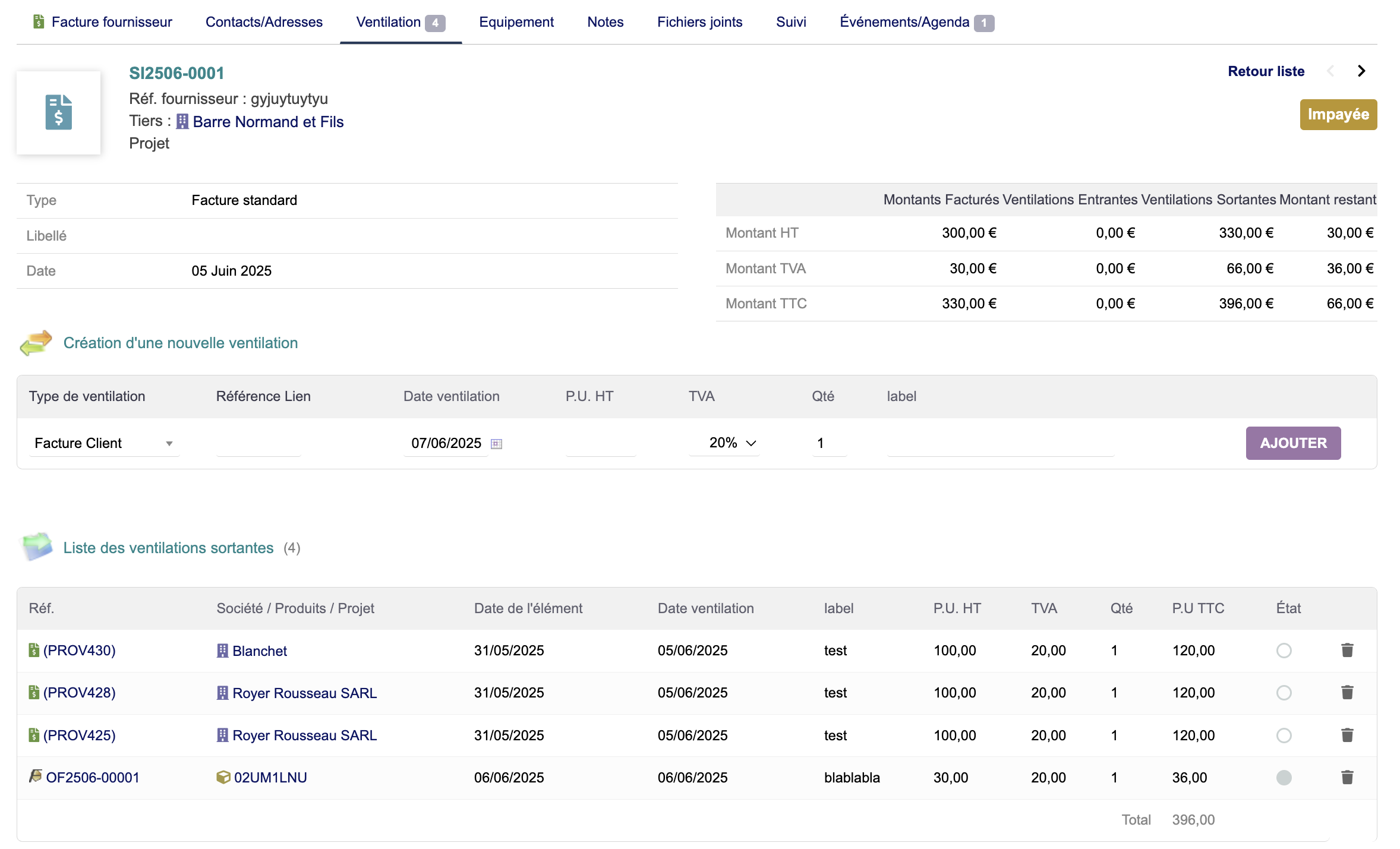 This module allows you to allocate supplier invoices and expense reports to better understand your margin. The allocation can be performed on customer/supplier invoices, tasks (and projects), interventions, and the Factory module. It is possible to total the allocated amounts and the difference between the invoice amount and the allocations on the native lists.