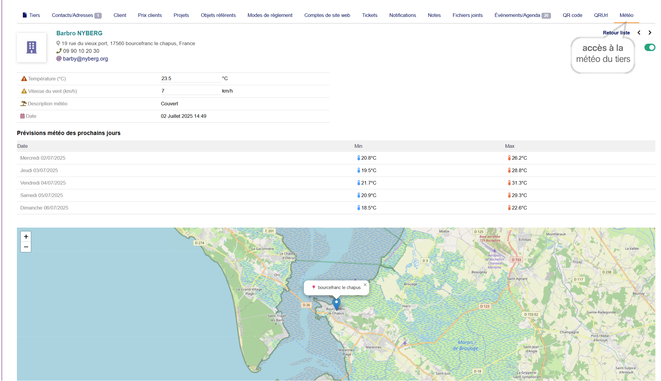 Weather module for Dolibarr, allowing you to display the current weather and forecasts for the following days for third parties (customers, suppliers, contacts) and projects. It uses the Open-Meteo API to provide accurate weather information.