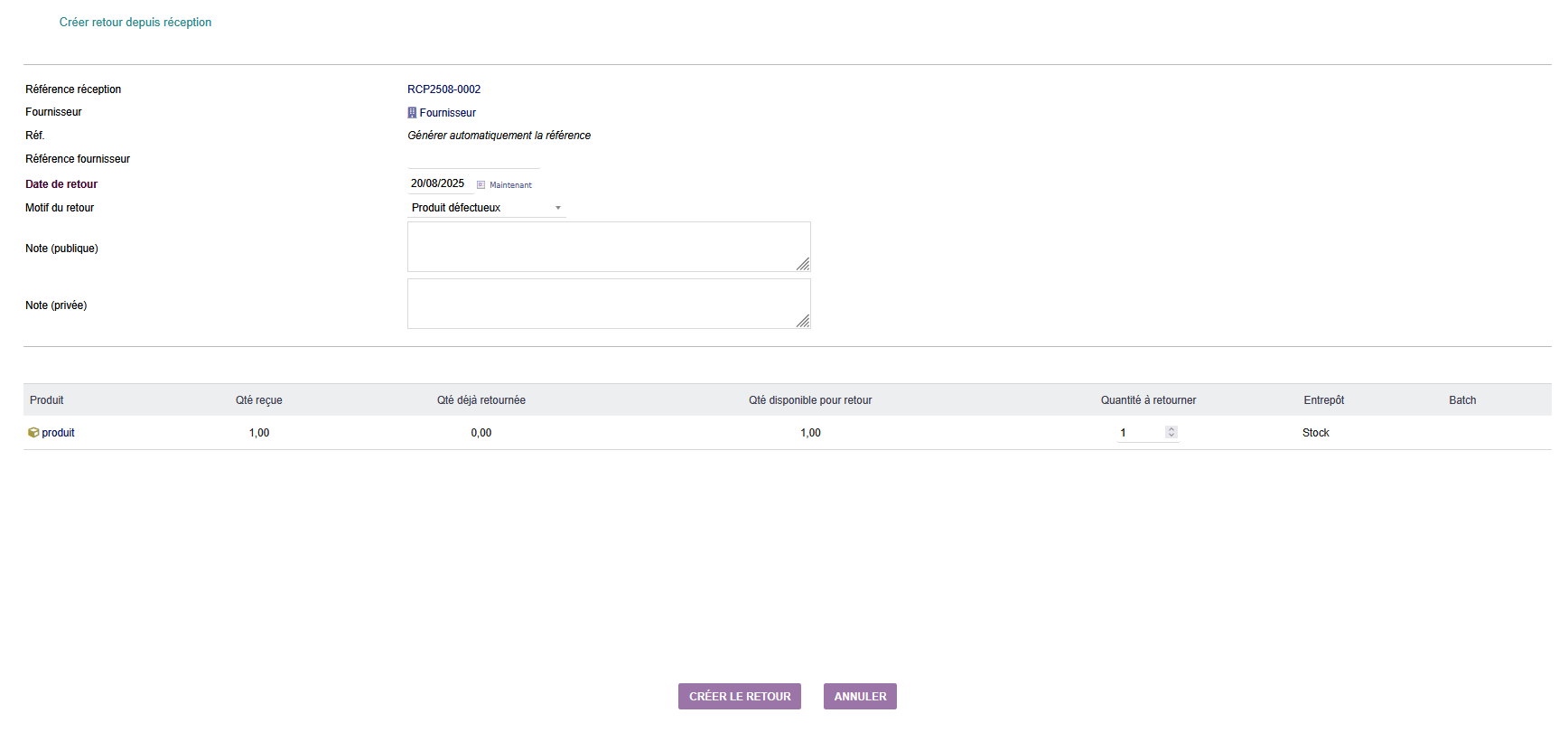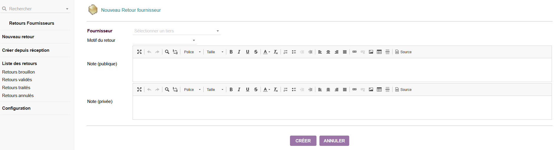 Module de gestion des retours de produits aux fournisseurs avec workflow complet : création depuis réceptions, contrôle quantités, mise à jour automatique du stock et génération d'avoirs.