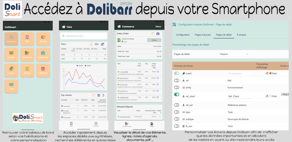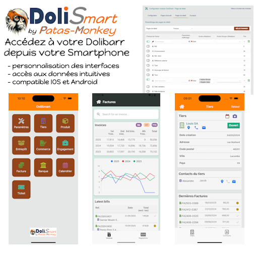 DoliSmart is compatible with Dolibarr from version 18. A demo environment is included in the application to test the application for 1 month.