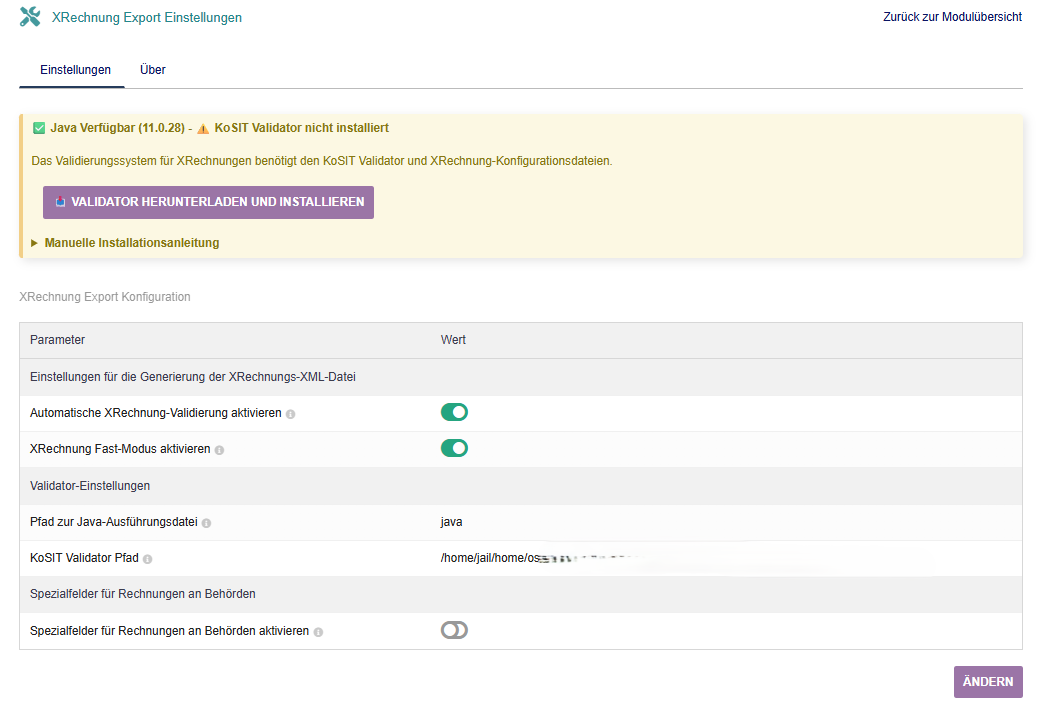 Please note: Due to its size, the validator code is not directly included in the module (uploading the module to Dolibarr would fail due to the size of approximately 50MB). After installing our module, the official KoSIT validator can be downloaded and installed directly from the module setup page with one click.