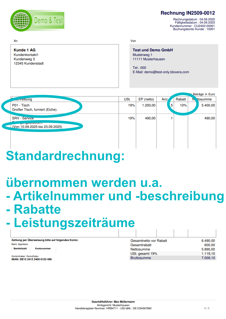 Support for various invoice types: XRechnung Export supports not only standard invoices, but also other invoice types. The module also generates correct credit notes, advance payment invoices, and final invoices. It transfers invoice parameters from Dolibarr into the XML, such as payment terms for invoice items, discounts, and service delivery dates. When invoicing public authorities, special fields can be activated (routing ID, official project number).