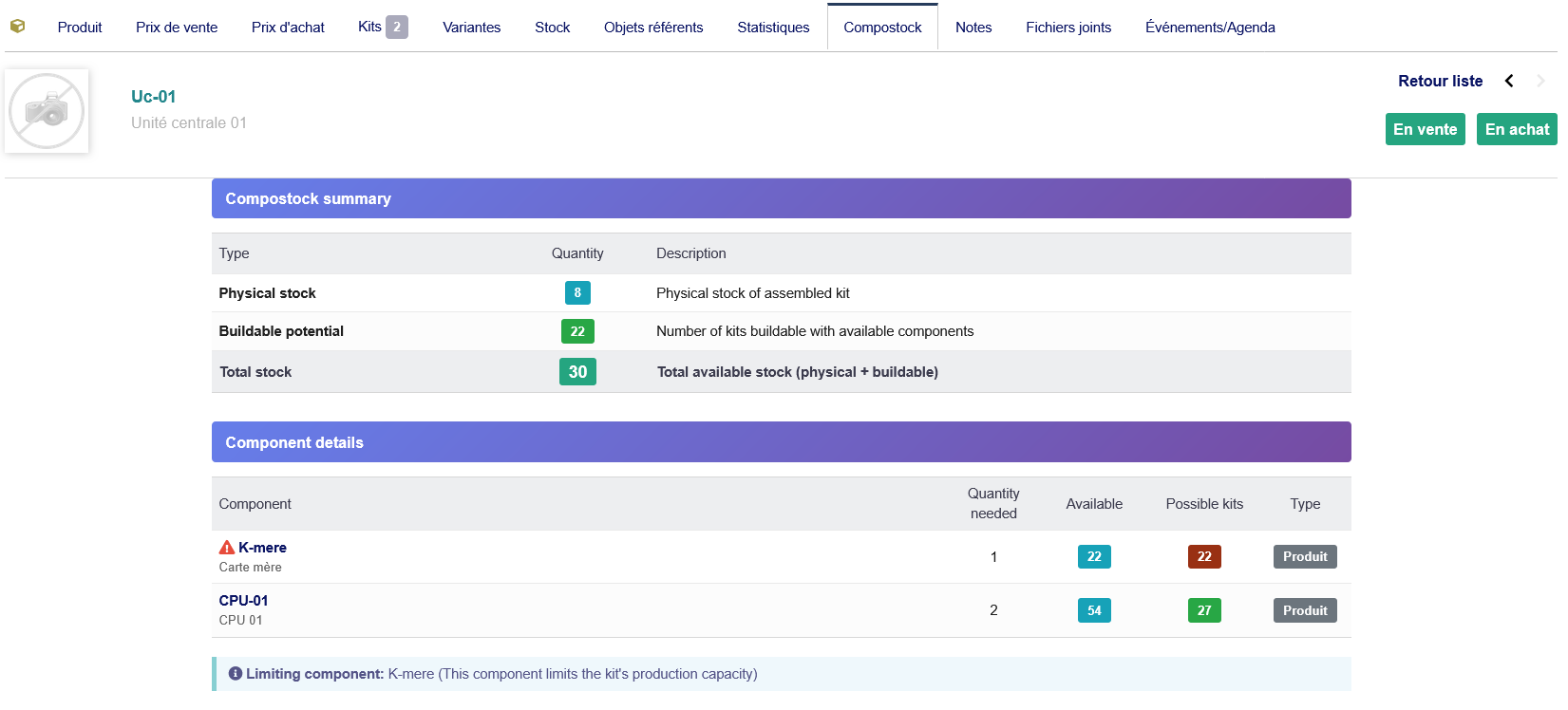 Compostock ottimizza la gestione dei vostri prodotti virtuali (kit) fornendo visibilità in tempo reale sulle vostre scorte effettivamente disponibili. Basta supposizioni, ottenete calcoli precisi che combinano scorte fisiche dei kit con quantità assemblabili.