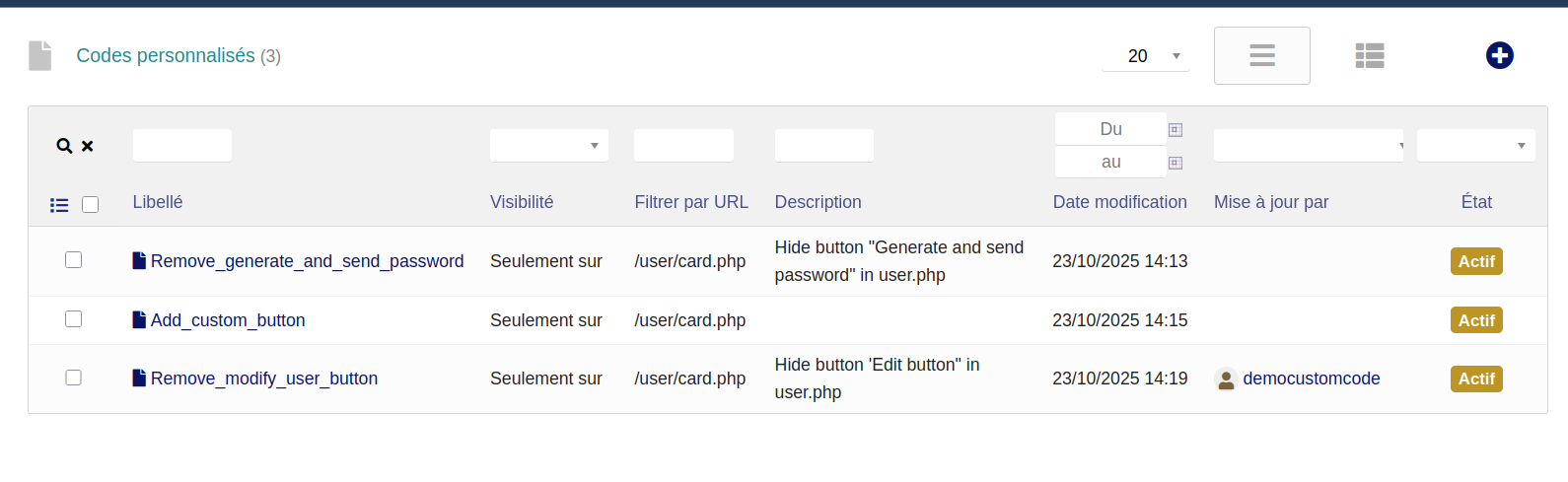 CustomCode can be activated or set to draft, duplicated, deleted like any Dolibarr object.