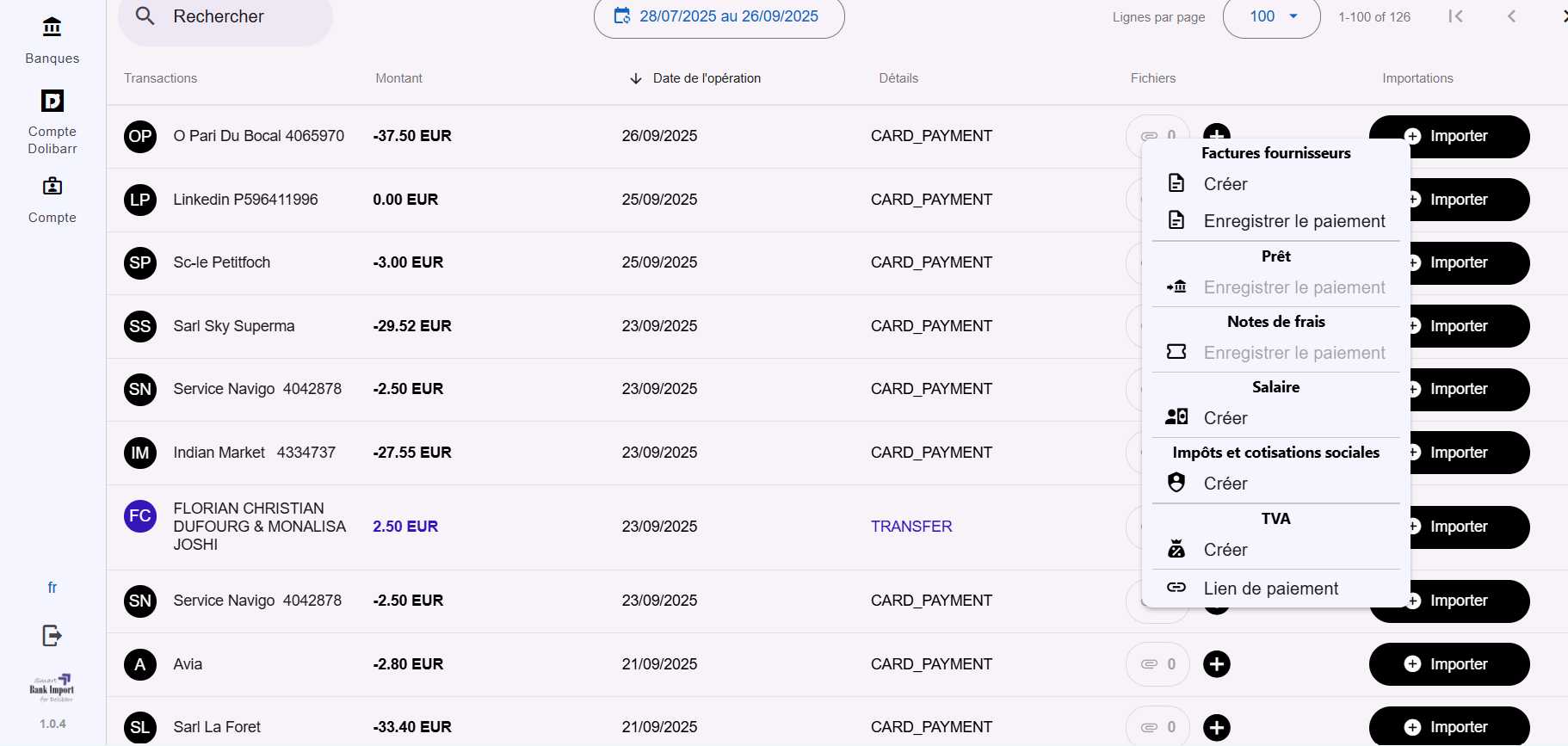 Smart Bank Import is an interface that allows you to connect your bank account through GoCardLess and your Dolibarr account through the API REST module. It enables you to create elements (such as invoices, payments, and taxes...) directly from your bank transactions.